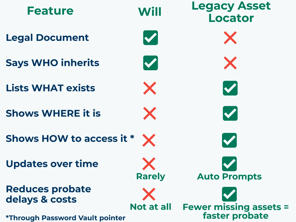 No. It’s the companion to your will: a living index that helps your people find your assets fast after you're gone.